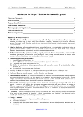 El documento presenta diferentes técnicas de dinámicas de grupo divididas en secciones como técnicas de presentación, técnicas divisorias, juegos de desinhibición, técnicas para el conocimiento, técnicas para fomentar la participación, técnicas de planificación y técnicas de organización. Cada técnica incluye un objetivo, materiales necesarios y una descripción del desarrollo de la actividad. Las técnicas van desde juegos para las presentaciones iniciales hasta ejercicios para generar conversación e