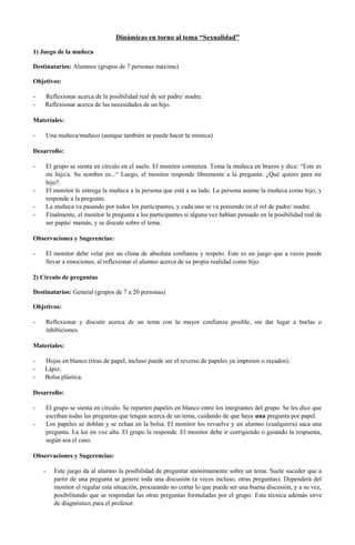 Este documento presenta 5 dinámicas grupales para trabajar el tema de la sexualidad y la prevención del VIH/SIDA. La primera dinámica involucra el cuidado de una muñeca para reflexionar sobre la paternidad/maternidad. La segunda usa preguntas anónimas escritas en papel para generar discusión. La tercera pasa un ovillo de lana para escuchar activamente. La cuarta usa un dado con preguntas sobre conocimientos, discriminación y prevención. La quinta simula la transmisión del VIH a través