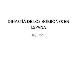 La dinastía de los Borbones gobernó España durante el siglo XVIII. Felipe V fue el primer rey Borbón tras la Guerra de Sucesión contra Carlos de Austria. Tuvo dos hijos con su primera esposa María Luisa y un hijo con su segunda esposa Isabel de Farnesio. Luis I y Fernando VI le sucedieron brevemente antes de que Carlos III asumiera el trono y tuviera a Carlos IV como hijo y sucesor, quien reinó durante el Motín de Esquilache y la Liberación del comercio.