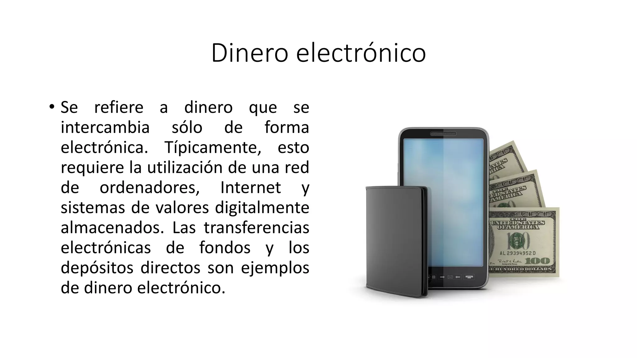 El documento define el dinero electrónico como dinero que se intercambia de forma electrónica a través de redes de ordenadores e Internet, con ejemplos como transferencias electrónicas y depósitos directos. Ofrece ventajas como ser un medio de pago voluntario y permitir pagos móviles sin necesidad de cuenta bancaria, pero tiene las desventajas de requerir electricidad y generar costos asociados a productos de crédito.