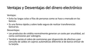 El documento habla sobre el dinero electrónico, que se refiere al intercambio de dinero de forma electrónica, rápida y segura a través de internet y redes de ordenadores. Menciona las ventajas como evitar largas filas en los bancos y realizar transferencias rápidas y seguras, y las desventajas como los costos anuales y comisiones por sobregiro o uso de cajeros automáticos ajenos. Finalmente, enumera temas aprendidos en el segundo bimestre como el uso de Slideshare, Blog, Dropbox, Flickr y Youtube