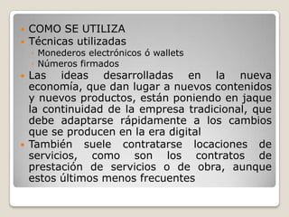 El documento define el dinero electrónico como dinero que se intercambia de forma electrónica a través de redes de ordenadores e Internet, requiriendo sistemas de valores digitalmente almacenados. Explica que se utilizan técnicas como monederos electrónicos, números firmados y proveedores en Internet como PayPal. Además, describe diferentes modalidades de dinero electrónico como tarjetas de crédito, débito, monederos electrónicos y tarjetas inteligentes.