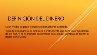 El dinero es un medio de pago aceptado regionalmente que tiene un valor fijo dentro de un país y se usa principalmente para comprar bienes y pagar servicios. Tiene su origen en la palabra latina "denarius", que era el nombre de la moneda usada por los romanos. El dinero se presenta comúnmente en forma de monedas y billetes, aunque también se usan otros métodos como el intercambio, los cheques y los pagos diferidos. Sus principales funciones son facilitar el intercambio comercial al ser de aceptación general, servir como depósito