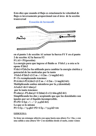1. El documento habla sobre la dinámica de los fluidos, incluyendo conceptos como flujo estacionario, incompresible, no viscoso y no rotatorio. También presenta las ecuaciones de continuidad y Bernoulli.