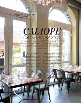 Caliope es un restaurante de cocina fusión internacional situado en el Teatro Amador de Panamá. Ofrece platillos creativos preparados con técnicas europeas usando ingredientes locales. Su chef, Martino Pace, cambia mensualmente la carta aunque mantiene platillos populares como "Un Francés en Panamá" y "Cordero RobesPierre". Los postres también son obras de arte, como "La Sorpresa" y "Los 7 Pecados Capitales". El restaurante busca brindar una experiencia culinaria que estimule los sentidos a