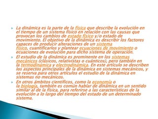 La dinámica estudia la evolución en el tiempo de sistemas físicos bajo la influencia de fuerzas. Aristóteles realizó las primeras contribuciones al tema, pero Galileo y Newton formularon las leyes fundamentales de la dinámica a través de experimentos sobre movimiento uniformemente acelerado. Estas leyes describen correctamente la mayoría de problemas de movimiento, pero fallan para altas velocidades o objetos muy pequeños.
