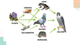 El documento explica la relación entre el biotopo y la biocenosis. El biotopo es el hábitat físico que proporciona los recursos para la biocenosis, que son las comunidades de organismos que interactúan en ese hábitat. Luego describe los niveles tróficos, incluidos productores, consumidores y descomponedores, y cómo estas relaciones tróficas se representan en cadenas y redes alimenticias.