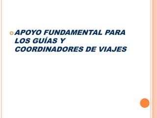 Este documento resume los principios fundamentales de la dinámica de grupos y ofrece recomendaciones para guías y coordinadores de viajes. Explica las diferentes fases por las que pasa un grupo, tipos de grupos, tipología de clientes, normas de atención, cómo tratar quejas y recomendaciones sobre seguridad. El objetivo es que los guías aprendan a identificar la dinámica interna de los grupos y satisfacer las necesidades de todos los miembros a través de la experiencia, el tacto, la diplomacia y una actitud posit