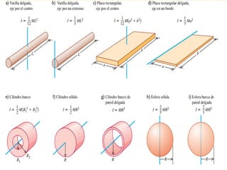 El documento aborda la dinámica de rotación y el movimiento de cuerpos rígidos, explicando conceptos clave como traslación, rotación, momento angular y momento de inercia. Detalla cómo estos conceptos se aplican en situaciones prácticas y presenta problemas estructurados para ilustrar las relaciones entre fuerzas, aceleraciones y movimientos. Además, se incluyen teoremas y principios como el principio de conservación del momento angular y el teorema de Steiner.