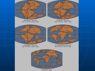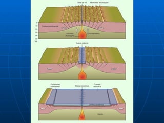 Este documento resume la teoría de la tectónica de placas. Explica que la corteza terrestre está dividida en placas que se mueven unas respecto a otras, impulsadas por corrientes de convección en el manto inferior. Las placas interactúan en tres tipos de bordes: divergentes donde se separan, convergentes donde chocan subduciéndose una bajo la otra, y transformantes donde se deslizan lateralmente. Estos movimientos de placas causan fenómenos como terremotos, volcanes y la deriva de los