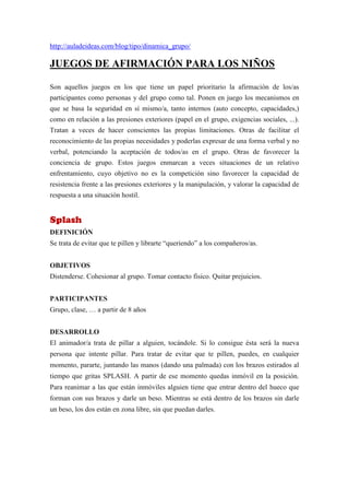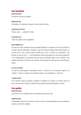 Este documento describe varios juegos de dinámica de grupo para niños. Los juegos se enfocan en la afirmación personal, la comunicación y el trabajo en equipo. Algunos juegos populares descritos incluyen "Splash" para fomentar el contacto físico, "Las lanchas" para enseñar a ayudar a los demás y "Las gafas" para ver las perspectivas de los otros. El objetivo general de estos juegos es mejorar las habilidades sociales y de comunicación de los niños.