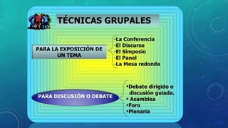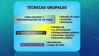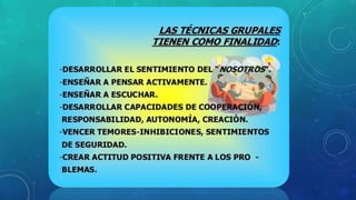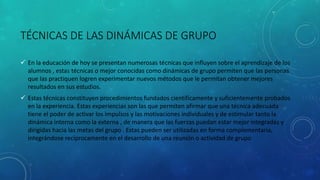 Este documento describe las técnicas de dinámicas de grupo y su importancia en la educación. Explica que estas técnicas permiten nuevos métodos de aprendizaje que conducen a mejores resultados académicos. También menciona que las dinámicas de grupo son procedimientos científicamente probados que activan la motivación individual y estimulan la dinámica interna y externa de un grupo para alcanzar metas comunes. El documento concluye que estas técnicas permiten confrontar diferentes puntos de vista en un ambiente