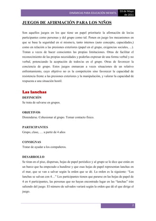 Este documento presenta varias dinámicas para su uso en educación infantil, con el objetivo de fomentar la afirmación personal, la comunicación, la cooperación y el conocimiento entre los niños. Describe juegos como "Las lanchas", "Cuando te queremos" y "Pelota imaginaria", explicando sus objetivos, participantes, desarrollo y evaluación. También presenta dinámicas para trabajar la comunicación como "La baraja de los cuentos" y para fomentar la cooperación, como "Ordenamos zapatillas" y "El lazo