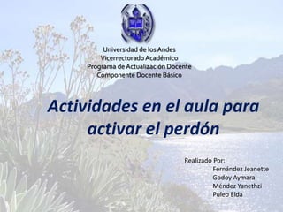 Este documento presenta dos dinámicas grupales para trabajar el tema del perdón en el aula. La primera dinámica consiste en una discusión de preguntas sobre el perdón. La segunda dinámica implica simbólicamente liberarse de ataduras mediante el perdón a otros y a uno mismo, y reflexionar sobre cómo se siente antes y después de perdonar. El objetivo general es enseñar a los estudiantes sobre la importancia del perdón y mejorar las relaciones interpersonales.