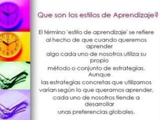 El documento presenta una actividad grupal para definir los conceptos de aprendizaje y enseñanza. Los participantes responden preguntas sobre cómo aprenden habitualmente y los resultados sugieren que las personas tienden a aprender de una de tres formas principales: visualmente, a través de la escucha o mediante la experiencia física.