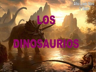 El documento resume el origen, alimentación, hábitat y teorías sobre la extinción de los dinosaurios. Explica que los dinosaurios evolucionaron de arcosauros primitivos hace 230 millones de años, y que sus patrones alimenticios se pueden deducir por sus dientes y cuerpos. También cubre la hipótesis de que las aves son parientes cercanos de los dinosaurios terópodos, y que el impacto de un meteorito hace 65 millones de años pudo haber causado su extinción al provocar incendios
