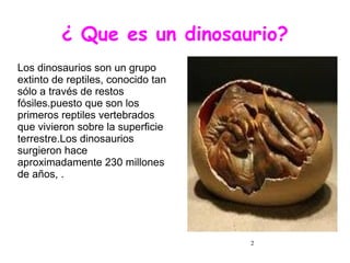 Los dinosaurios eran un grupo extinto de reptiles que vivieron en la Tierra hace aproximadamente 230 millones de años hasta su extinción hace 65 millones de años. Habitaron los continentes en formación y se adaptaron a los cambios climáticos, incluyendo bosques y pantanos. Algunos eran herbívoros que se alimentaban de plantas, mientras que otros eran carnívoros u omnívoros. Los fósiles que dejaron han permitido a los paleontólogos estudiarlos y clasificar diferentes tipos como el Braquiosaurio y el