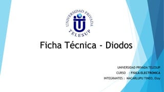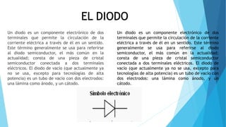 Este documento proporciona información técnica sobre diferentes tipos de diodos, incluidos diodos semiconductores, diodos de vacío, diodos Zener, diodos LED, diodos láser, fotodiodos y diodos varactores. Describe las características clave de cada tipo de diodo como su tensión de trabajo, corriente máxima, color, potencia de salida y más. Además, incluye tablas con especificaciones técnicas de varios modelos populares de cada tipo de diodo.