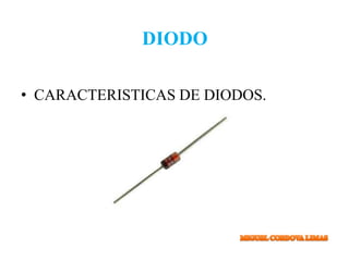 Este documento describe las características de varios tipos de diodos, incluyendo diodos Zener, diodos túnel, diodos Gunn, diodos LED y diodos de unión. Los diodos Zener funcionan como reguladores de tensión cuando se polarizan de forma inversa, mientras que los diodos túnel pueden funcionar como amplificadores debido a su resistencia negativa. Los diodos Gunn generan microondas mediante el efecto Gunn y los LEDs indican polaridad a través de su tamaño y forma. Finalmente