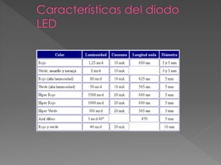 El documento describe diferentes tipos de diodos, incluyendo diodos semiconductor, diodos de vacío, diodos zener, diodos LED, diodos rectificadores, diodos Schottky y diodos túnel. Explica las características clave de cada tipo de diodo como su comportamiento en polarización directa e inversa, su tensión umbral, corriente máxima y aplicaciones comunes.