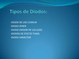 Este documento describe cinco tipos principales de diodos: diodos de uso común, diodos Zener, diodos emisores de luz (LED), diodos de efecto túnel y diodos varistor. Explica brevemente el funcionamiento y características de cada tipo de diodo, incluyendo que los diodos de uso común y Zener conducen en una dirección, los LEDs emiten luz visible cuando están polarizados directamente, los diodos de efecto túnel permiten el paso de portadores con bajos voltajes