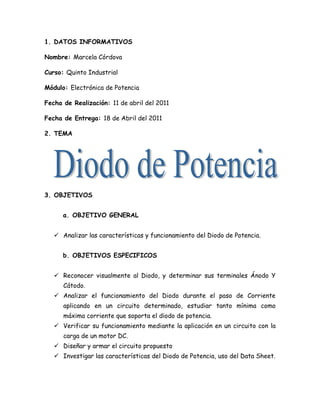El documento describe las características y funcionamiento del diodo de potencia. Explica que los diodos de potencia pueden soportar altas corrientes con bajas caídas de tensión en conducción, y altas tensiones inversas con pequeñas fugas en bloqueo. También describe parámetros como la tensión de trabajo, corriente máxima, tiempo de recuperación y disipación de potencia. El documento provee una descripción detallada de las propiedades estáticas y dinámicas del diodo de potencia.