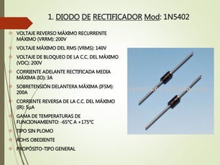 Este documento contiene las especificaciones técnicas de varios tipos de diodos, incluidos diodos rectificadores, diodos láser infrarrojos, diodos LED de alta potencia, diodos de 3V y diodos zener. Proporciona detalles sobre las características eléctricas y físicas de cada diodo como voltaje, corriente, potencia, longitud de onda y temperatura de funcionamiento.