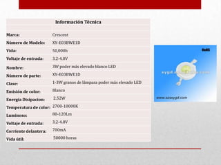 El documento contiene información técnica sobre varios tipos de diodos, incluyendo LEDs blancos de 3W, diodos zener de 15V, diodos rectificadores de 1000V y diodos zener de 4,3V. Proporciona detalles como la marca, el número de modelo, las especificaciones de voltaje, corriente y temperatura de cada dispositivo.