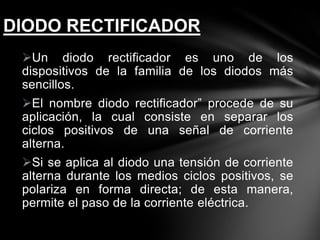 El documento describe diferentes tipos de diodos, incluyendo diodos rectificadores, diodos láser, diodos Zener, fotodiodos y diodos LED. Cada tipo de diodo se describe brevemente, destacando sus características principales y usos.