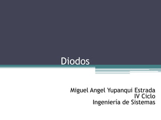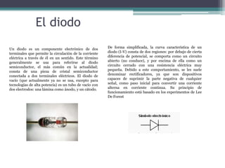El documento resume las características de varios tipos de diodos, incluyendo diodos, diodos LED, diodos rectificadores, diodos Zener, diodos túnel y diodos varicap. Describe las funciones de cada tipo de diodo y sus curvas características de tensión-corriente. También incluye ejemplos de fichas técnicas de diodos desarrolladas por empresas privadas.