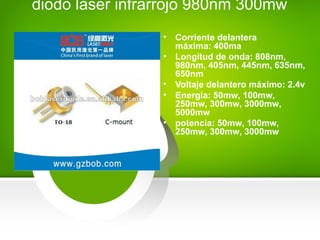 El documento describe diferentes tipos de diodos, incluyendo sus especificaciones técnicas como la corriente máxima, voltaje, longitud de onda, potencia y temperatura de color. Se proporcionan ejemplos de diodos láser infrarrojos, diodos rectificadores, diodos zener y diodos LED de alta potencia.