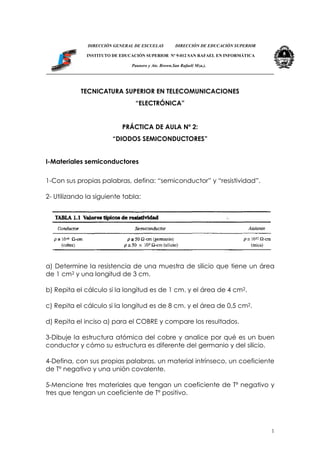 Este documento presenta una práctica de aula sobre diodos semiconductores. Contiene cinco secciones que cubren materiales semiconductores, niveles de energía, materiales extrínsecos tipo n y tipo p, diodos semiconductores y niveles de resistencia. La práctica incluye definiciones, cálculos, dibujos y preguntas sobre las propiedades y comportamiento de los diodos semiconductores.