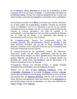 Dioniso era el dios griego del vino, la agricultura y el teatro. Era hijo de Zeus y Sémele y se le consideraba un dios extranjero. Presidía los ritos religiosos mistéricos como los de Deméter y Perséfone. Dioniso inducía el éxtasis a través del vino y la locura, liberando a la gente de su ser normal.