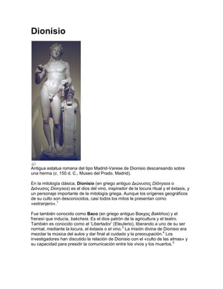 Dionisio era el dios griego del vino, la fertilidad y el éxtasis en la mitología griega. Tuvo un nacimiento inusual al ser hijo de Zeus y una mortal llamada Sémele, y fue criado por varias figuras como las ninfas y Hermes. Representaba los ritos agrícolas y místicos relacionados con el vino y era adorado a través de misterios religiosos.