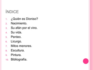 Dioniso fue el dios griego del vino, la agricultura y el teatro. Nació de la unión entre Zeus y Semele y tuvo que enfrentarse a la ira de Hera. Promovió el cultivo de la vid y el consumo de vino. Castigó a aquellos que no reconocieron su divinidad, como Penteo y Licurgo. Siempre fue representado con racimos de uvas y copas de vino.