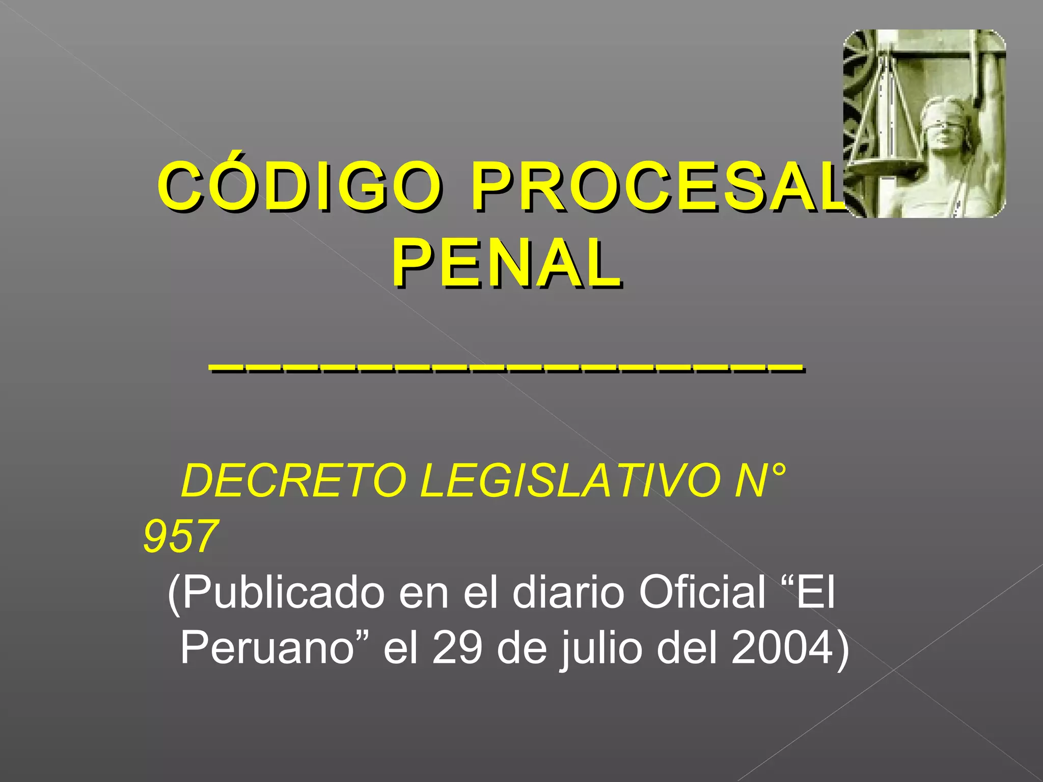 Este documento resume las principales disposiciones del Decreto Legislativo N° 957 publicado en Perú en 2004. Establece que el Ministerio Público es el titular de la acción penal y debe conducir y controlar jurídicamente las investigaciones realizadas por la policía desde el inicio del caso. El Ministerio Público debe trazar la estrategia de investigación completa y estar presente en todas las diligencias preliminares importantes para controlar jurídicamente la investigación policial.