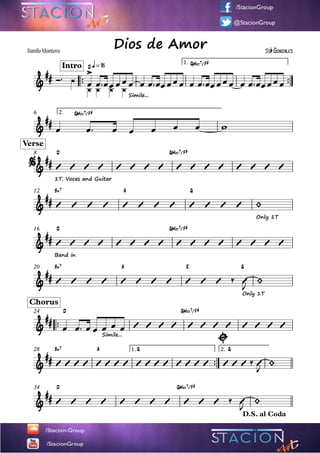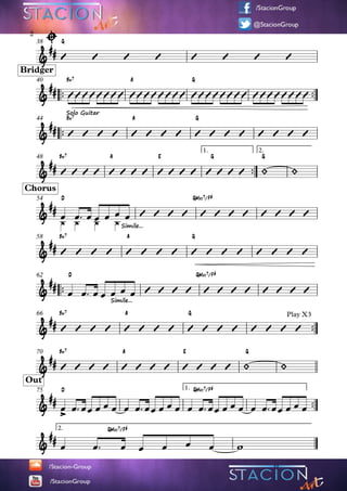 El documento presenta la progresión de acordes y la estructura de una canción. La canción comienza con una introducción y continúa con una primera estrofa cantada, seguida de un solo de guitarra y repeticiones del estribillo. La canción termina con acordes finales y una coda. La progresión de acordes y las secciones musicales se repiten tres veces a lo largo de la canción.