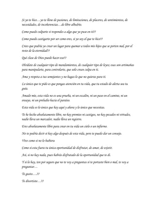 El documento presenta un discurso en el que Dios le dice a la humanidad que deje de creer en las enseñanzas religiosas tradicionales. Dios dice que quiere que las personas disfruten de la vida en la naturaleza, que no se culpen por su sexualidad o limitaciones, y que confíen en sus propios sentimientos y juicios más que en mandamientos o leyes. Dios también dice que esta vida es lo único que hay y que las personas son absolutamente libres, sin premios ni castigos después de la muerte.