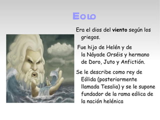 Eolo era el dios del viento en la mitología griega. Era hijo de Helén y la náyade Orséis y hermano de Doro, Juto y Anfictión. Se le describe como rey de Eólida, que más tarde se llamó Tesalia, y se le considera el fundador de la rama eólica de la nación helénica.