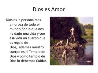 Dios nos ha dado la vida y nuestro cuerpo como un regalo, por lo que nuestro cuerpo es el templo de Dios y debemos cuidarlo. Para cuidar nuestro cuerpo, debemos hacer ejercicio regularmente, leer la Biblia para nutrirnos espiritualmente, y comer una dieta balanceada con frutas, verduras, granos y proteínas para mantenernos saludables. Al cuidar nuestro cuerpo como el templo de Dios, le demostramos nuestro amor y gratitud hacia Él.