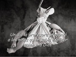Una profesora preguntó a sus estudiantes cómo saben que Dios existe si no lo han visto. Pedro, un niño tímido, respondió comparando a Dios con el azúcar en la leche, diciendo que aunque no se ve el azúcar, sin él la leche no tendría sabor, al igual que sin Dios nuestras vidas carecerían de significado. La profesora quedó impresionada por la profunda respuesta de Pedro.
