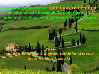 Cuando alguien te dice  'QUE DIOS TE BENDIGA'  no solo te está deseando lo mejor para ti,   sino que también esta actuando en favor suyo Pues cuando Bendices a alguien también atraes el favor de Dios hacia ti.