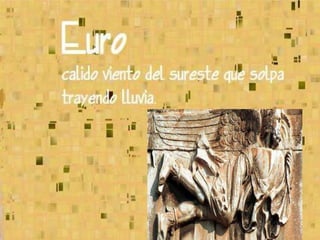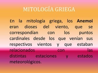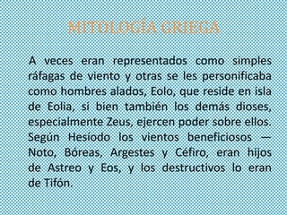Los Anemoi eran dioses griegos asociados con los vientos que soplaban desde los puntos cardinales y estaban relacionados con las estaciones y el clima. A veces se les representaba como ráfagas de viento y otras como hombres alados. Según Hesíodo, los vientos beneficiosos eran hijos de Astreo y Eos, mientras que los destructivos eran hijos de Tifón.