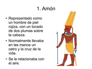 El documento resume 13 de los dioses más importantes de la mitología egipcia, incluyendo a Amón, Ra, Atón, Isis, Osiris, Horus, Maat, Ptah, Thot, Anubis, Sobek, Bastet y Seth. Cada dios se describe brevemente con su representación, símbolos y dominios asociados.