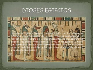 Los dioses egipcios personificaban elementos naturales, eventos de la vida y sentimientos. Había un gran panteón de dioses egipcios que vivían en los templos terrenales según su creencia, por lo que los egipcios rezaban, bailaban y ofrecían sacrificios para honrarlos y asegurar su presencia continua. Algunos de los principales dioses incluían a Ra, dios solar; Osiris, dios de los muertos; Isis, diosa de la fertilidad; y Horus, dios del trono y protector