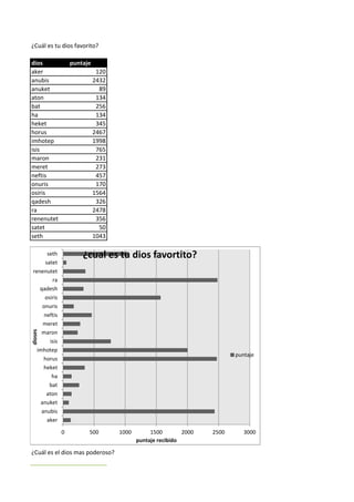 El documento presenta tres encuestas sobre dioses egipcios antiguos, mostrando los resultados de votos o "puntajes" recibidos por cada dios. La primera encuesta muestra los puntajes de varios dioses menores. La segunda encuesta encuentra que Osiris, Horus e Imhotep son los tres dioses más poderosos. La tercera encuesta determina que Horus es el dios más importante, seguido de Ra.