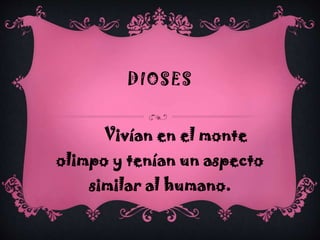 Este documento presenta una breve descripción de varios dioses de la mitología griega. Los dioses vivían en el monte Olimpo y tenían apariencia humana. Se mencionan a Zeus, el rey de los dioses; Poseidón, dios del mar; Hades, dios de los muertos; Atenea, diosa de la sabiduría; Hermes, mensajero de los dioses; Afrodita, diosa del amor; Apolo, dios de la profecía y la música; Artemis, diosa de la c