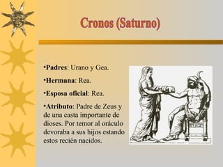 El documento resume las genealogías y atributos principales de las deidades de la mitología griega. Describe que Cronos era el padre de Zeus y devoraba a sus hijos recién nacidos por temor a un oráculo. Zeus se convirtió en el dios del cielo y la tierra. Hera era la esposa de Zeus. Hades era el dios del inframundo. Poseidón era el dios del mar. Hestia, Deméter y Hera eran hermanas de Zeus.