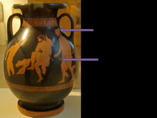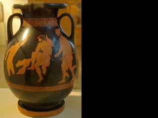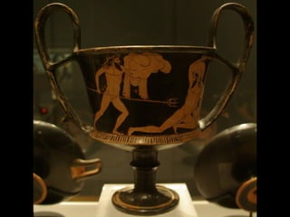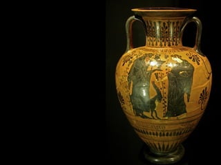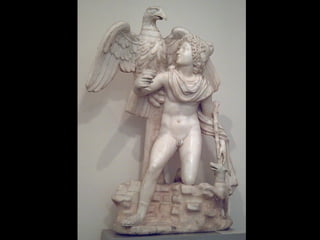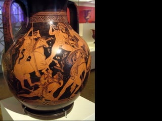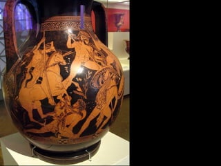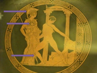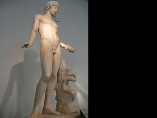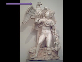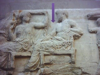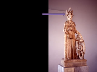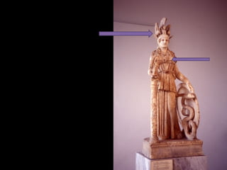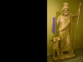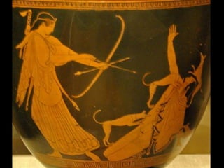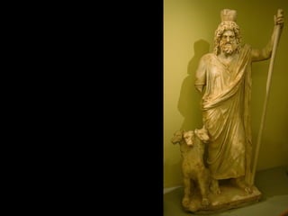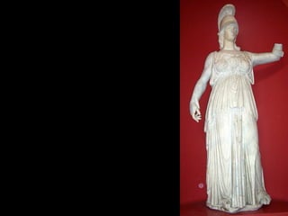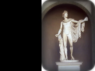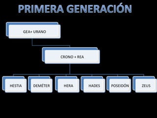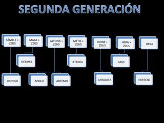 Este documento presenta una lista de los principales dioses del panteón griego, incluyendo a Hestia, Deméter, Hera, Hades, Posidón, Zeus, Dioniso, Hermes, Apolo, Árteminas, Atenea, Afrodita, Hefesto y Ares, junto con breves descripciones de cada uno de sus dominios y roles.