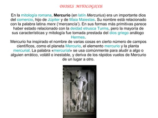 Mercurio era un importante dios romano del comercio e hijo de Júpiter y Maia. Tomó prestadas muchas características del dios griego Hermes, inspirando nombres como el planeta Mercurio y el elemento mercurio. Su rápido vuelo de un lugar a otro dio origen a la palabra "mercurial".